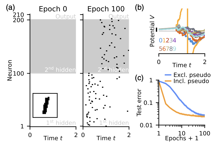 图 4. MNIST任务。(a)三层网络尖峰栅格图。左:学习前的沉默神经元。右:学习后的稀疏尖峰。(b)学习后输出神经元的电压动态;(c)分类误差动态。在测试期间也使用伪峰值在早期训练中产生较小的测试错误。