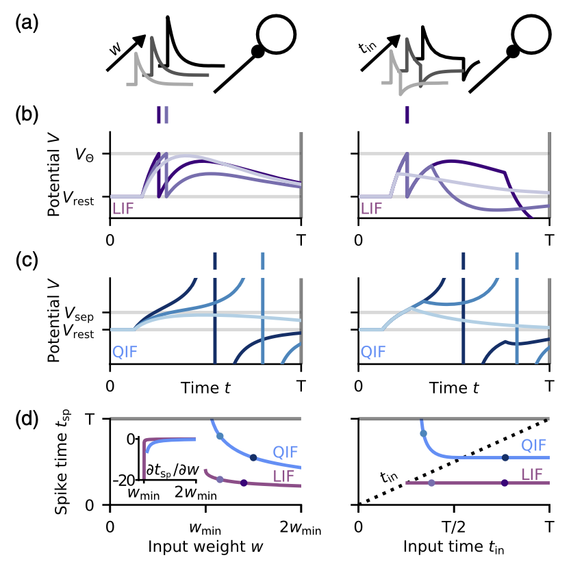 图 1. 扰动和非扰动尖峰形态。(a),(b),(d) 在试验过程中,LIF神经元的峰值时间可能出现中断。(a),(c),(d) QIF神经元的峰值时间仅在试验结束时无扰动地出现,其他时间随参数的变化而连续变化。左列:一个神经元接收到一个单一的输入,其权重增加(随着饱和度的增加而增加)。右列:神经元接受兴奋性和抑制性输入,其到达时间被移动到更大的时间。