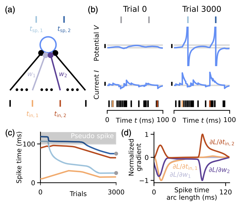 图 2. QIF神经元的平滑梯度下降学习。(a)学习两个输入的权重和时间来调整前两个输出尖峰时间。(b)左:学习前,神经元没有尖峰。右图:学习后,神经元在期望的时间出现尖峰。(c)在学习过程中,伪尖峰时间平滑变化。(d)损失函数L的梯度分量在学习过程中不断变化。学习进度显示为自学习开始以来输出尖峰时间轨迹弧长的函数