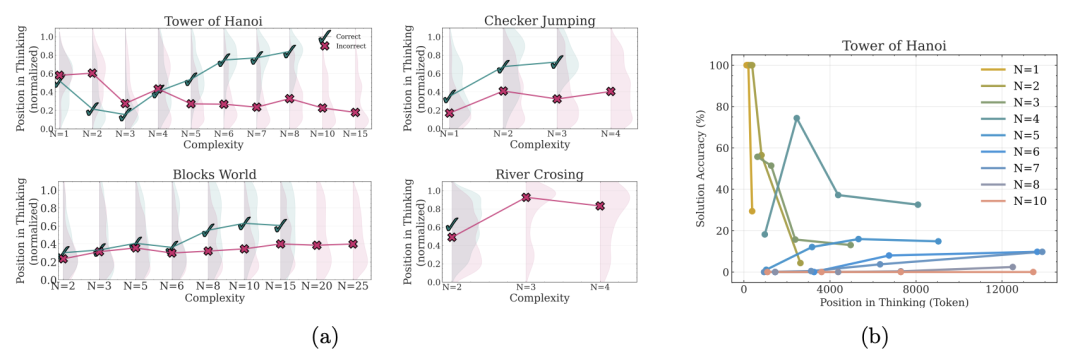 图 4. 左和中:在四个不同复杂程度的谜题的推理轨迹中,中间解决方案的位置和正确性。✓表示正确的解决方案;x 表示不正确的解决方案,用阴影表示分布密度;右图:河内塔在不同复杂程度下的解决方案准确性与思考位置。简单问题(N=1-3)表现出早期的准确性随着时间的推移而下降(过度思考),中等问题(N=4-7)表现出持续推理的准确性略有提高,复杂问题(N≥8)表现出持续接近零的准确性,表明完全推理失败。