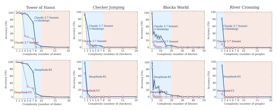 高复杂度阶段:无论思维与否,所有模型准确率均骤降,出现“推理崩溃”现象——无法给出任何有效解答。