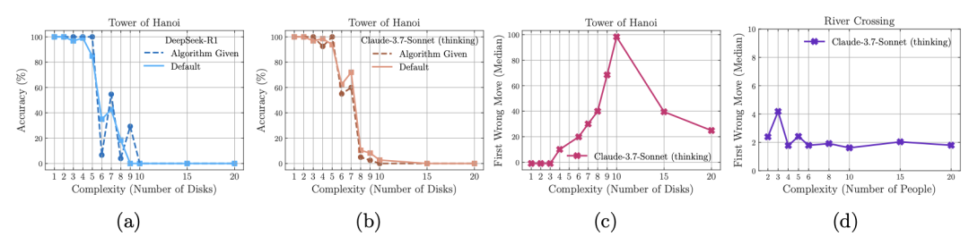 图 5. (a)和(b)尽管在提示符中提供了求解算法,但执行失败发生在相似的点,突出了逻辑步骤执行中的推理模型局限性。(c)和(d)值得注意的是,Claude 3.7 Sonnet模型在河内塔的无错误序列比在过河情景中的早期错误长得多。