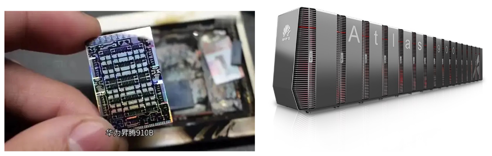 下图是我国生产的华为AI推理芯片(其中NPU是搭载了8颗昇腾910B,而CPU是配备了4颗鲲鹏920,左图)和人工智能超级计算机华为昇腾 Atlas900(右图)。