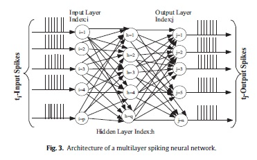 (3) 如果我们在神经网络加入神经元,用发射脉冲 (spike) 序列传输信息,我们得到SNN (spiking neural network) [26](如下图)。