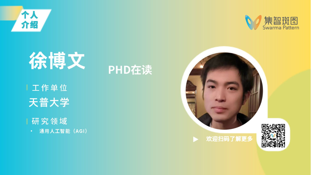 2022年于北京大学取得硕士学位,美国天普大学PhD在读,研究方向为通用人工智能(AGI),致力于探索心智的工作原理、建立通用智能的统一理论、创造通用人工智能和解放人类的脑力劳动。2014年获得福建省机器人竞赛冠军、全国二等奖;作为第一发明人获授权多项发明和实用新型专利;曾在AGI Conference发表文章和参与审稿。近期研究着眼于为通用智能中的感知运动过程建立可解释的模型。