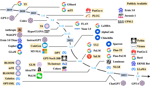 近年来现有大型语言模型的时间线(规模大于 10B)