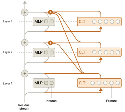 近期,开发Claude大模型的团队Anthropic公司提出了一系列基于Claude行为表现的大模型可解释性工作 [41][42],名为AI生物学(AI biology)。他们对于大模型解释的架构主要来自跨层转码器(Cross-Layer Transcoder,CLT)的应用。如下图所示,CLT内部有编码器和解码器,每一个CLT模块把某一层的残差作为输入,解码的输出则重构预测该层后续所有层的输出,同时考虑解码器权重的正则化,使得token和CLT表征之间的对应关系可以尽可能稀疏。