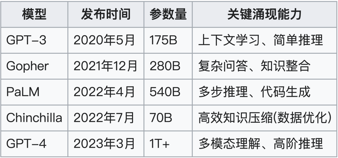 这些能力包括数学推理(如多步计算与逻辑判断)、链式思维(Chain-of-Thought,CoT)推理、编程与代码生成、跨任务泛化能力(如零样本任务迁移)、事实知识记忆、多语言翻译与理解等。所有这些能力往往在较小模型上完全缺失或表现极差。研究表明,这些涌现并非线性延伸,而是与模型规模、训练数据量、指令微调策略等因素交互产生的非平滑性能跃迁。