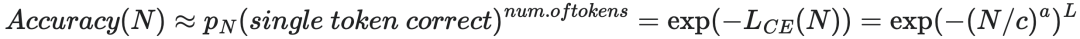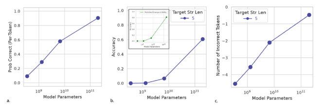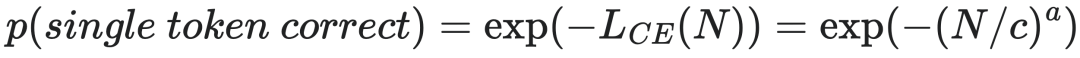 如下图a所示,此时模型能力的度量指标(p(single token correct)随模型规模(模型参数量N)的变化可以得到平缓增长的曲线。而若某任务是L位整数加法,当模型输出正确结果时,记录模型正确率为1,否则记为0,则此时模型的性能和模型参数量的关系为: