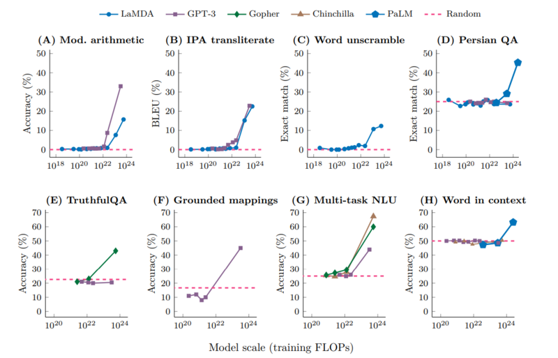 在不同任务上,以模型规模为x轴,以模型能力为y轴绘制曲线,可以观察到模型能力随着模型规模增大的变化情况,并发现模型能力发生明显提升的部分。在达到一定规模之前模型表现平平,之后能力提升至远高于随机水平,这就表示模型能力出现了涌现的现象。下图展示了五个语言模型家族使用少量样本提示时,在八类任务上展现的涌现能力。