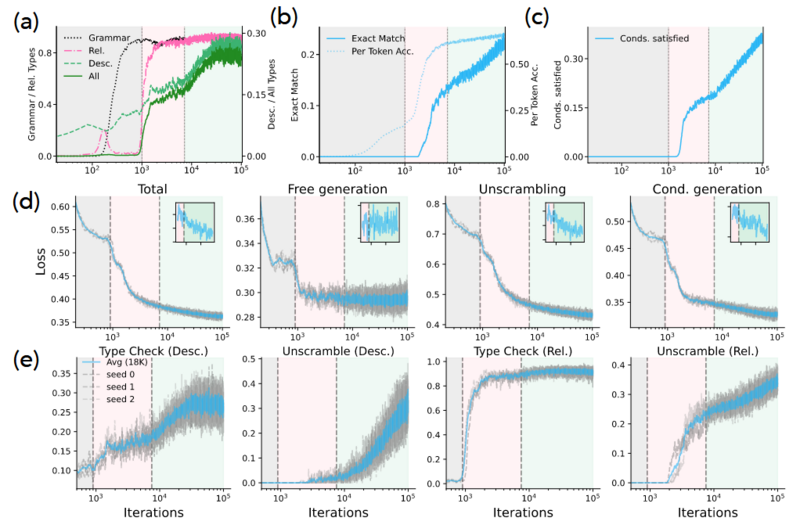 在大约第 1000 次迭代时,模型在“关系型类型检查”上的表现突然从几乎为零跳跃至近乎完美。这一跃迁正好伴随着所有任务(尤其是自由生成任务)的损失突降。 这一涌现恰好发生在模型首次达到最高语法性准确率的时间点。这表明,一旦模型学会了数据的第一个结构(语法),它很快就会学习第二个结构(关系型类型约束)。 描述型约束(descriptive constraints)的表现也有所提升(因而“整体类型检查”准确率上升),但仍徘徊在略高于 0.1 的水平。 因此,模型在此阶段主要依赖其语法知识,并未真正掌握描述型类型约束。 在该阶段中,可以观察到打乱复原与条件生成任务的表现也突然跃升,所有评估指标均显著改善。尤其是这些任务的损失曲线也显示出再次下降的趋势(图d)。 图e显示,这些性能提升主要来源于无需依赖描述约束的句子(即只需语法与关系型知识即可完成的任务)。