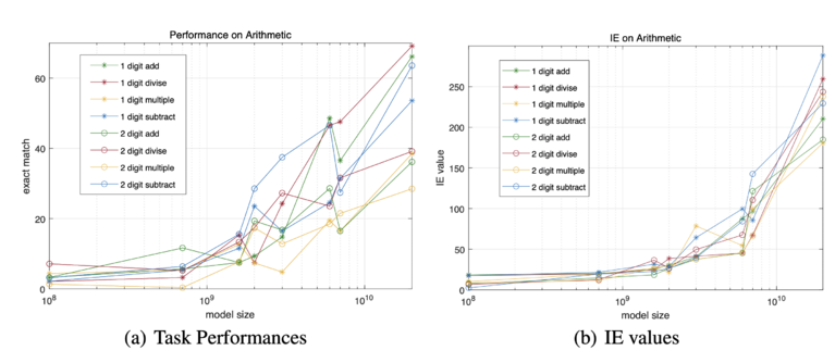 IE可以用来直接指示大模型能力的提升。研究中评估了8个算术任务(一位数和两位数的加减乘除)的表现与IE值之间的关联关系(如下图所示)。当参数量达到109至1010时,任务性能出现显著提升,表明存在涌现现象。在同一参数范围内,平均IE值也显著增加。