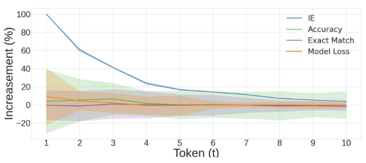 IE和其他指标随着token数量增加的增长幅度的变化。纵轴度量的计算方式是(value(t) − value(t − 1))/value(t)。