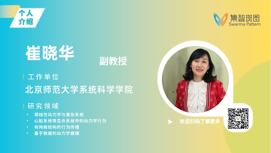 北京师范大学系统科学学院副教授、博士生导师,博士毕业于北京师范大学物理系,并于2007至2009年期间赴美国加州大学洛杉矶分校(UCLA)联合培养。长期从事非线性动力学与复杂系统研究,关注复杂网络结构下的动力学演化,如心脏系统等生命系统中的动力学行为、有网络结构的行为传播及基于数据的动力学建模。