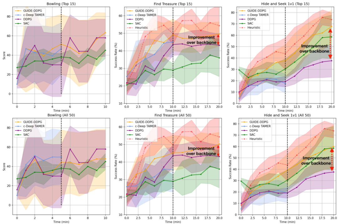 为验证框架有效性,研究团队在视觉导航(寻宝)、多体对抗(捉迷藏)和运动控制(保龄球)三类任务中展开系统性实验(图4)。结果显示,在仅接受10分钟人类反馈加10分钟自动化训练的条件下,GUIDE在寻宝任务中的成功率较DDPG(Deep Deterministic Policy Gradient)基线最高提升30%,在相同的人类指导时间下,较改进版c-Deep TAMER提升50%。值得注意的是,在动态对抗的捉迷藏任务中,智能体能够快速逼近专家设计的启发式奖励上限,且GUIDE达到基线相同性能所需的训练时间缩短一半,展现出显著的计算效率优势。