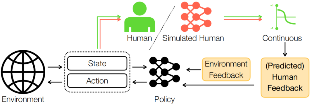 其次,反馈模拟器的引入实现了从“人工指导”到“自主进化”的平滑过渡。在人类引导阶段,系统将连续反馈转化为密集奖励,与稀疏环境奖励融合驱动策略优化;进入自动化阶段后,神经网络模拟器在线学习人类反馈模式,逐步替代人工输入(图3)。关键技术层面,作者采用最先进的强化学习实现方法,对Deep TAMER (Training an Agent Manually via Evaluative Reinforcement)进行了改进,实现了处理连续动作空间的actor-critic框架,结合模型架构(即目标网络软更新, target net soft update)和优化策略(即Adam优化器代替随机梯度下降)方面的进展,不仅将Deep TAMER扩展到连续动作和最新的强化学习实践中,还保持了将实时人类反馈整合到学习过程中的核心方法。
