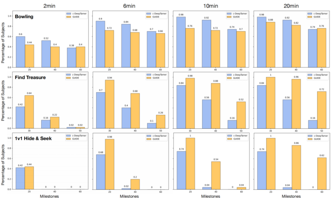 图5. GUIDE框架对个体差异的强稳健性。从左到右,显示了模型性能随训练时间的变化情况。在每个子图中,X轴是以任务得分量化的训练里程碑,Y轴表示在给定时间内能够训练智能体达到里程碑的人类比例。