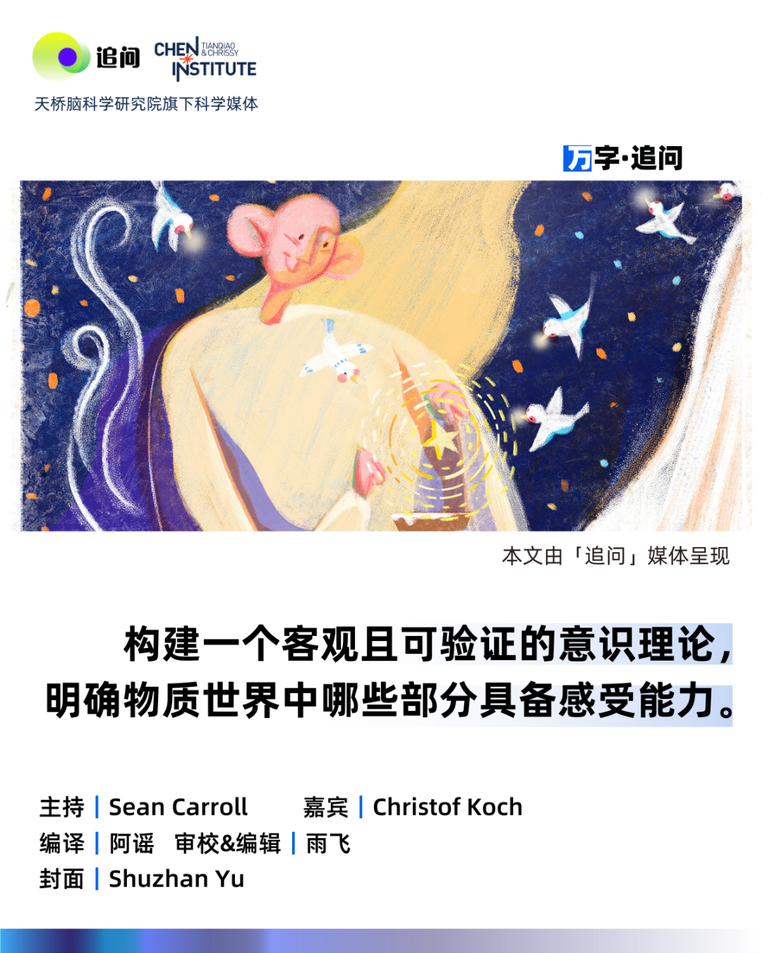 理论物理学家肖恩·卡罗尔(Sean Carroll)邀请神经生理学家克里斯托夫・科赫(Christof Koch)展开了一场深刻的对谈。科赫是探寻意识神经关联方面的领军人物,同时也是一种特定的意识研究方法,即整合信息理论(IIT)的倡导者。