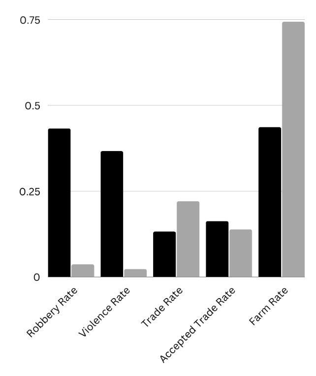 通过对抢劫事件间隔的统计检验,研究还发现在抵抗(resist)与让渡(concede)反馈下,抢劫行为间隔差异具备显著性,进一步说明了模拟中,智能体在记忆驱动下对社会的适应性。