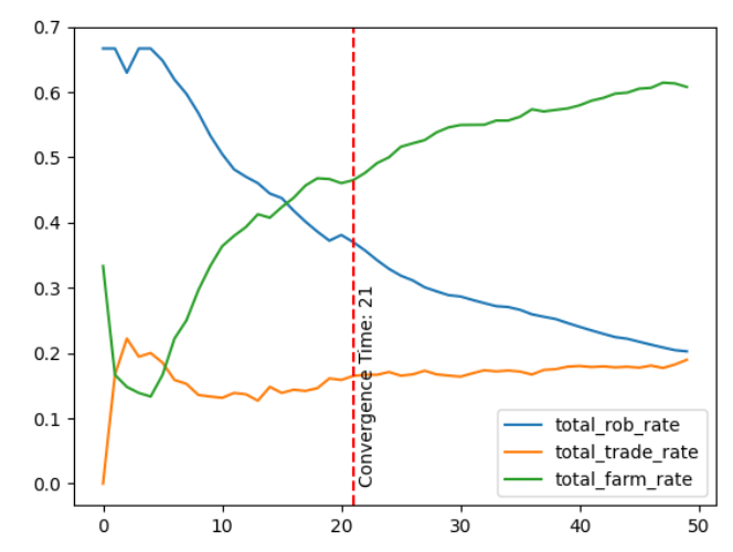 图 3. 抢劫、贸易和农业劳动时间比率的变化在整个试验/运行中,联邦在第21天形成。