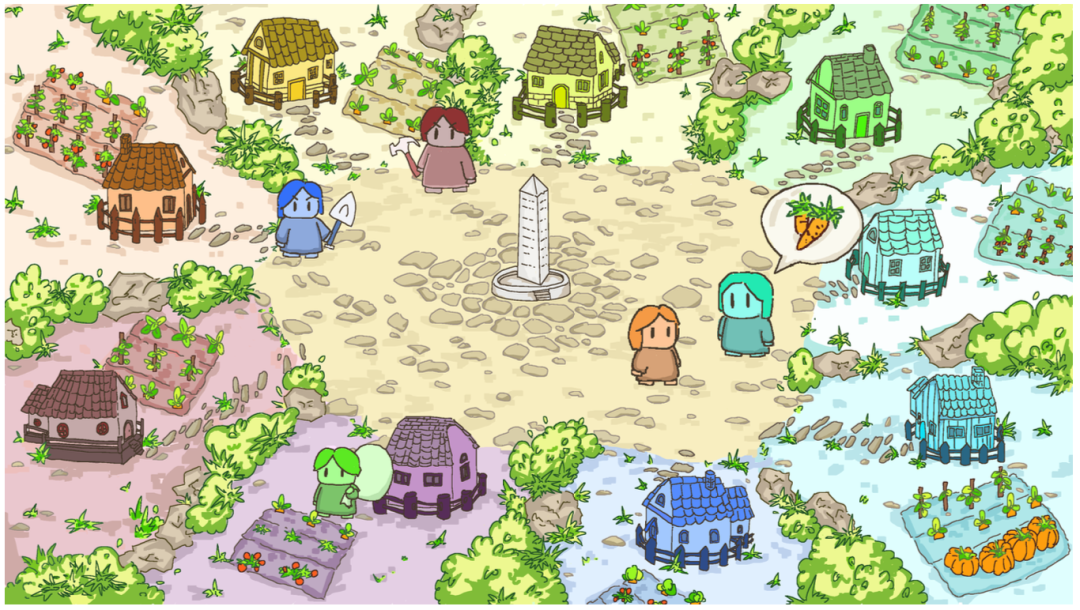 图 1. 该图像可视化了我们的LLM智能体运行的模拟环境。有两种类型的资源(食物和土地)。智能体每天都要在耕种(用自己的劳动生产食物)、交易(交换资源)或与其他智能体发生冲突(以获取更多资源为目标)之间做出选择。他们的主要动机是生存。