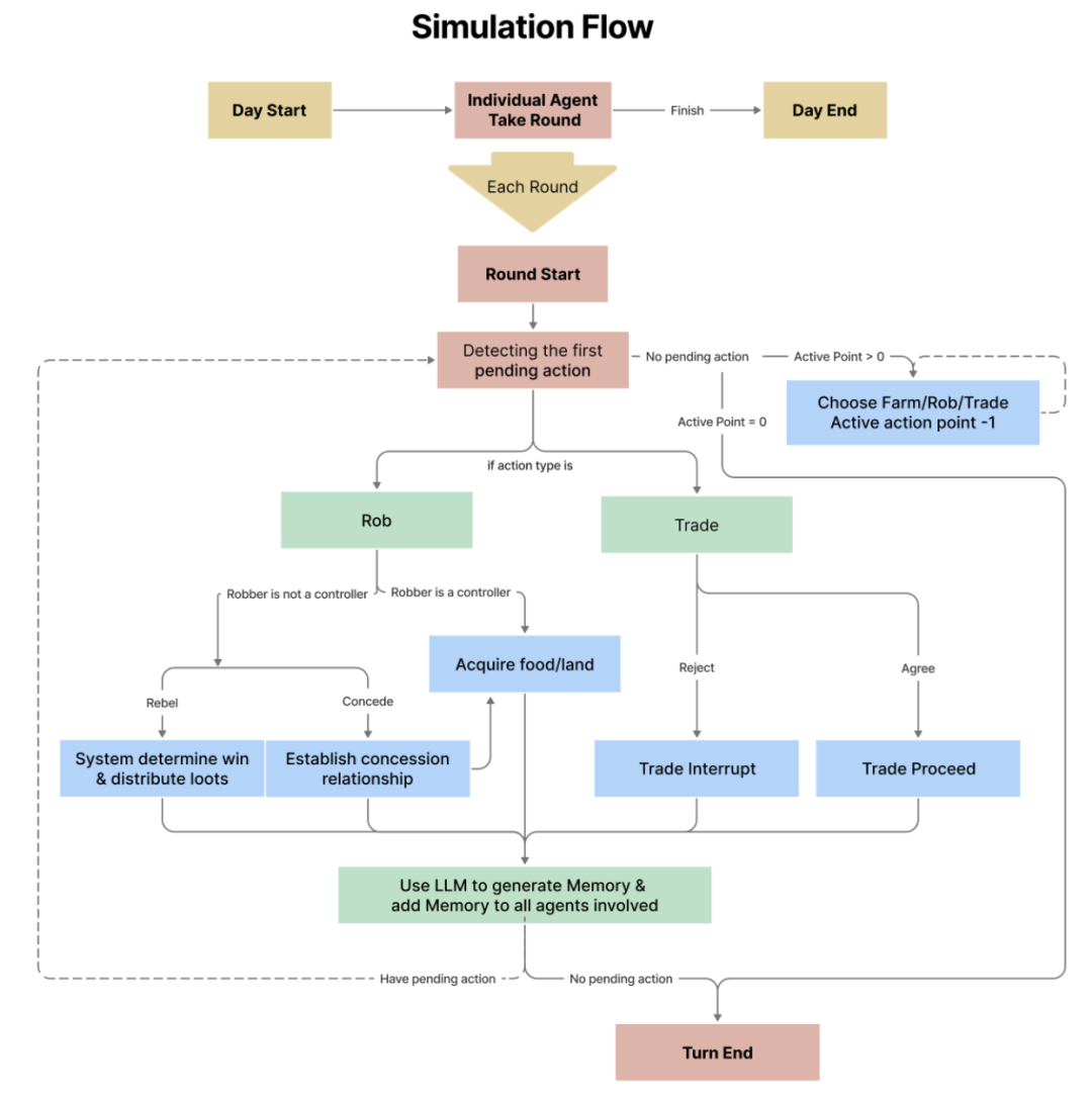 图 2. 流程图显示了“一天”中的模拟流程,其中每个智能体轮流执行操作并响应其他智能体执行的操作。