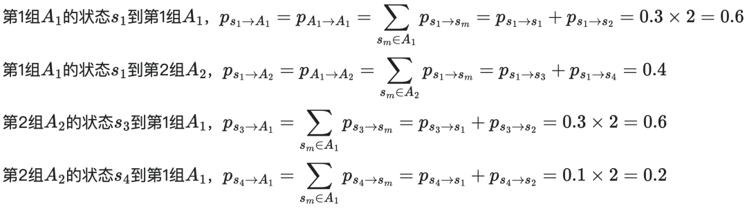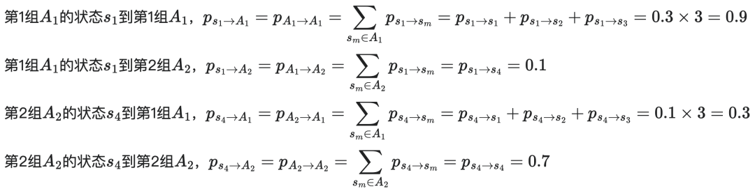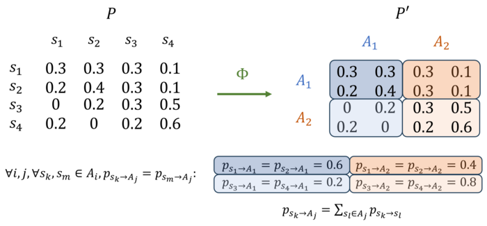 当我们构建粗粒化后的尺寸为2×2的宏观马尔科夫链P′时,分组A到分组B的概率应满足:从A或B的中任一微观态出发,转移到A或B中各个状态的总概率必须相同,这是根据条件概率的加法公理而自然导出的要求。