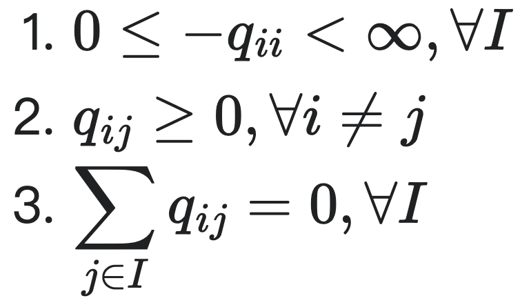 有上面三个条件可知Q矩阵的每一行中的非对角线元素可以为任意非负实数,只需要满足每行非对角元素之和有限这一个限制:
