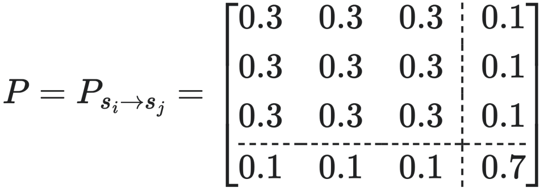 2. 转移概率(transition probability),即式子1.3或式子2,对任何微观初始状态(starting vector) π 都保持一致,从而我们能够得出宏观的概率转移矩阵