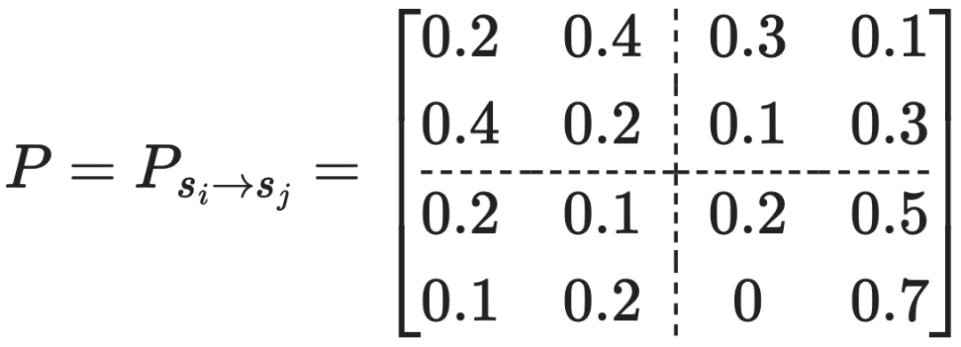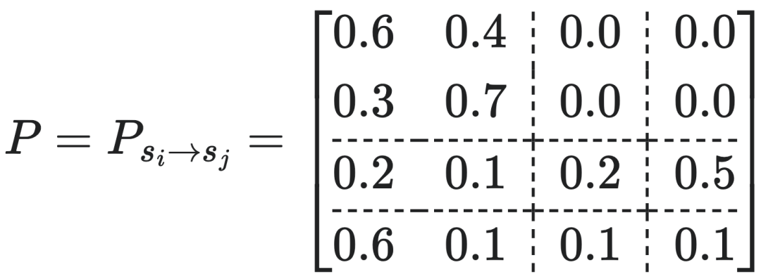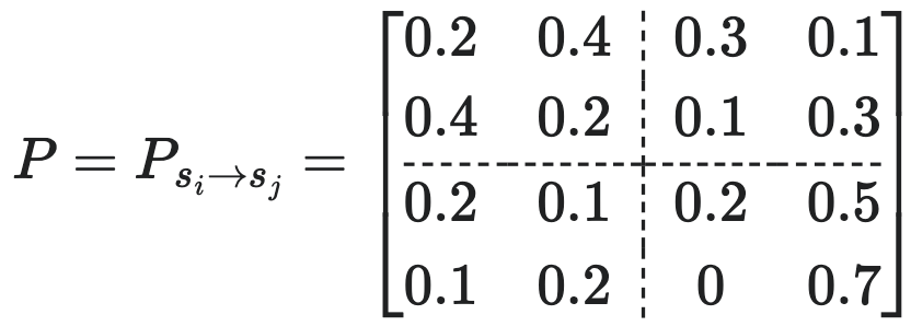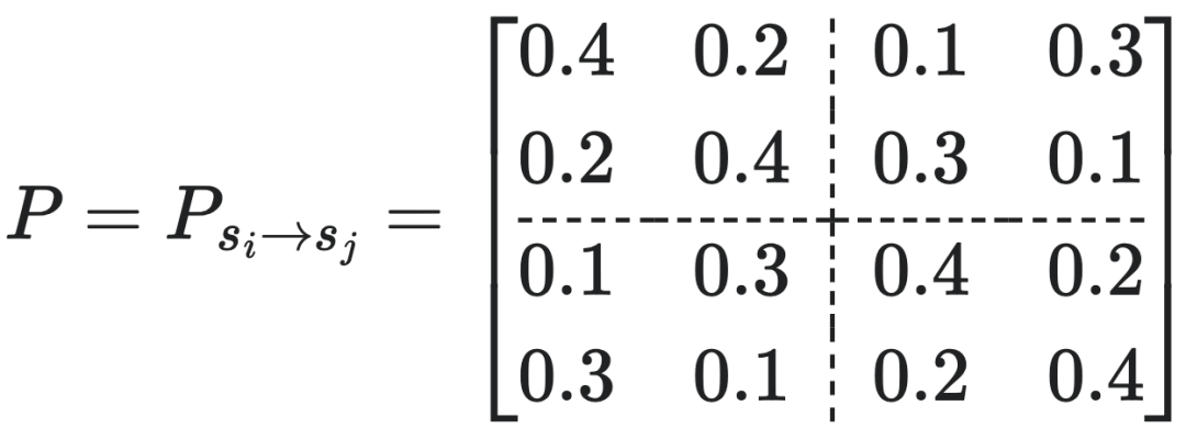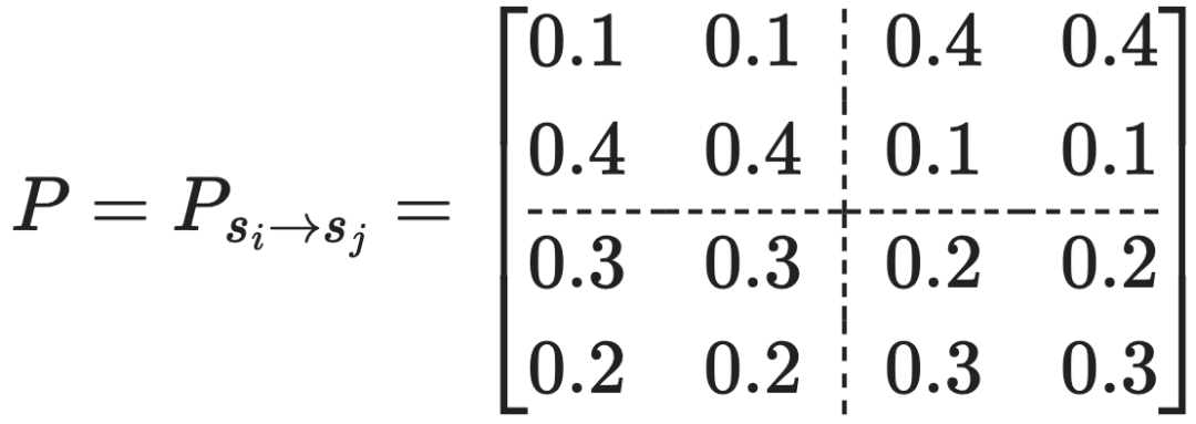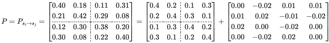 比如设左下角的所有元素的概率=0.6,右下角的所有元素概率=0.4,则我们可强行得到一个宏观转移概率矩阵(TPM):
