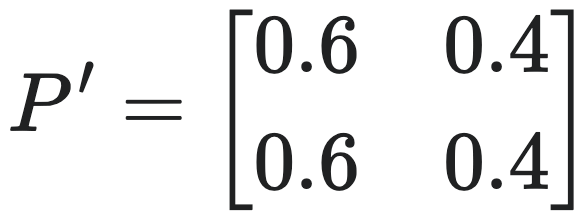 例如,图中的P′左上角的元素(组A到组A的概率)等于微观态1或微观态2转移到A的概率,都等于0.6。同理,右上角的元素(组A到组B的概率)等于0.4。