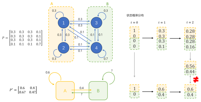 然而,当我们计算左下角的(即组B到组A的概率)的概率时发现:从微观态3转移到组A的概率为0.3+0.3=0.6,从微观态4转移到组A的概率为0.1+0.1=0.2。这种组内转移概率的冲突导致我们无法定义唯一的B→A的宏观转移概率。
