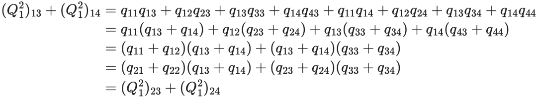 为什么强成块的Q矩阵能得到强成块的P矩阵呢?当我们计算P矩阵时,我们需要进行泰勒展开。这里我们检查一下展开中的(Q1)2项。以这个例子为例,q13+q14=q23+q24。通过计算得知,