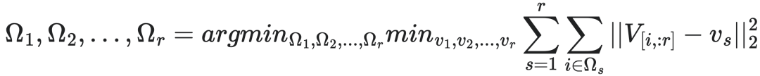 这个算法看起来非常熟悉,实际上它与 k-Means 聚类算法非常相似。让vs和组里的V[i,:r]距离最小的方法,就是让vs成为V[i,:r]这若干个点的中心。