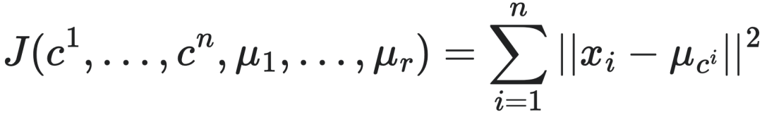 回顾一下k-Means算法把n个点聚成r类的目标函数,其中第i个点被归到第ci类,而μj为第j类点的中心点:
