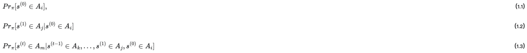 1. 式子1.1:初始宏观状态分布:系统在t=0,在微观状态分布为π的条件下,任意微观状态s(0)属于某个宏观状态Ai的概率;