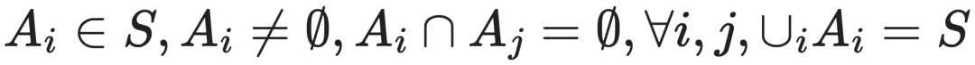即:1. A中的每个元素Ai都包括若干个si;2. Ai和Aj之间没有交集,即每个si只能属于一个Ai;3. S中的每个元素都必须属于某个A的元素,即A覆盖了S。