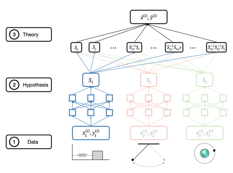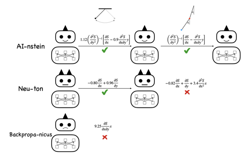 图1. 人工智能科学家的进化。不同的人工智能科学家从同一物理系统的数据中学习,即使是在简单的钟摆实验中,也会得出不同的结果。不能支撑当前实验数据的理论被标记为错误的。幸存的人工智能科学家面临着更复杂的系统,比如双摆。人工智能科学家修改他们的理论来模拟新的数据。最终,剩下的人工智能科学家会学到什么?