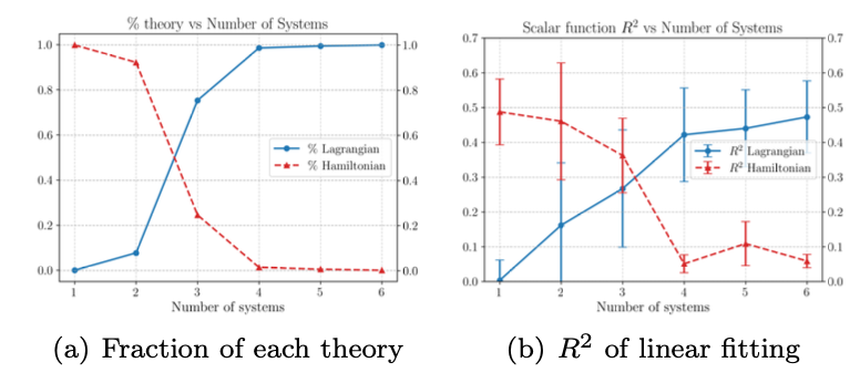 图 5. MASS从学习哈密顿理论切换到学习拉格朗日理论。(a)知道c1和c2是相反符号(拉格朗日符号)和相同符号(哈密顿符号)的MASS科学家的比例。(b)激活值与拉格朗日势与哈密顿势的线性拟合的R2分数。误差条表示R2评分的标准差。