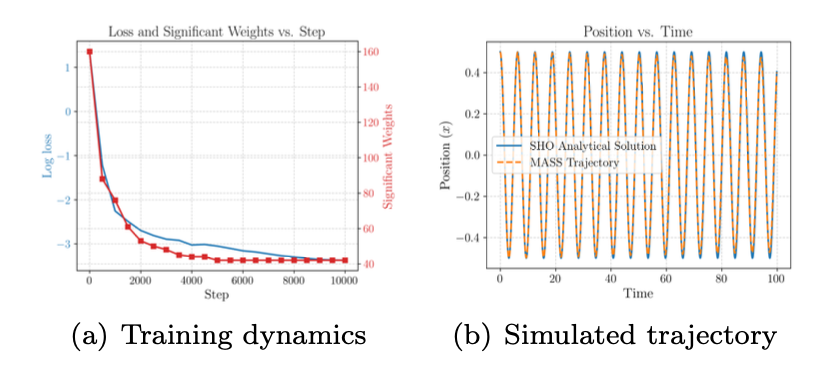 单系统实验:当MASS仅接触简谐振子时,模型迅速收敛到低均方误差,并在最终线性层中筛选出数十个显著权重项。尽管理论项远多于传统