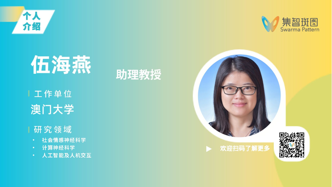 伍海燕,澳门大学助理教授,博士生导师,认知与脑科学中心(CCBS)核心成员。她于北京师范大学获得认知神经科学博士学位,曾在中国科学院心理研究所任副教授,并于2017–2019年赴美国加州理工学院(Caltech)开展访问研究。伍海燕教授长期从事社会认知神经科学研究,聚焦于社交互动中的情绪调节、同理心、道德决策及其神经机制。她系统结合行为实验、fMRI、EEG/iEEG、心理生理、眼动追踪等多模态技术,提出多项创新性实验范式与分析框架,相关成果发表于《Nature Communications》《iScience》《NeuroImage》等国际主流期刊。主持澳门科技发展基金项目、国家自然科学基金项目等多项科研课题,积极参与国际学术服务,担任IEEE ICDL 2020副编辑、《Communications Psychology》《Brain Sciences》等期刊编委。她还多次组织社会神经科学主题国际会议与论坛,现为IEEE、SfN、OHBM等多个国际学会成员。