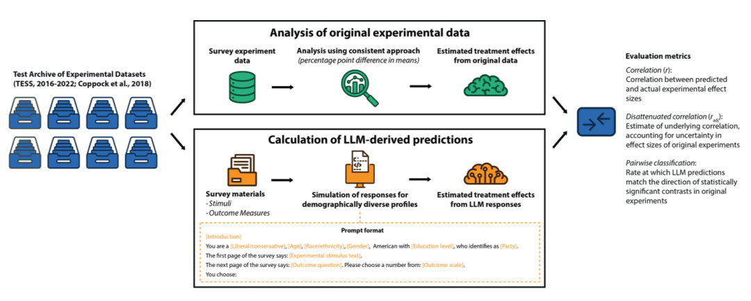 每项实验通过不同的文本刺激(如框架信息、身份暗示、舆论引导等)影响参与者对政治态度、文化信念或公共卫生行为的自评。随后,研究团队精心设计提示词模板,包括实验背景介绍、受试者画像(性别、年龄、种族、教育、党派等)、文本刺激以及结果量表说明,以此反复调用 GPT-4 对数百个“虚拟受试者”进行模拟。在得到每个模拟样本对特定条件下的回答后,研究者计算组均值差异,形成 LLM 预测的处理效应。