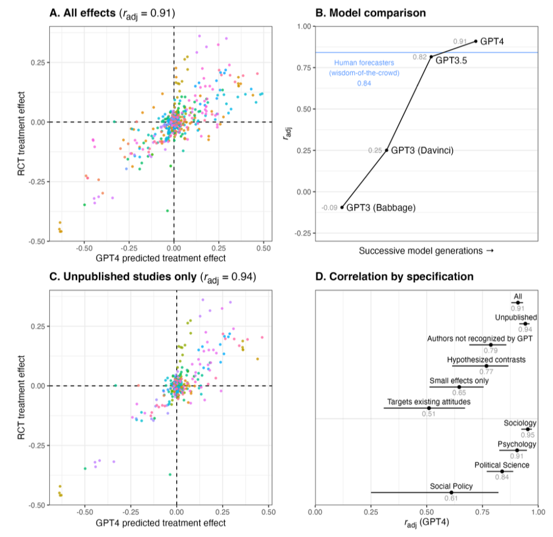 在 476 个处理对比中,GPT-4 预测的效应与原始实验效应的皮尔逊相关系数高达 0.85,其中显著效应的方向预测准确率达到 90%。更为关键的是,33 项在 GPT-4 训练截断前未公开的实验中,相关性更进一步升至 r=0.90,排除了模型从训练数据中“记忆”结果的可能。与此形成鲜明对比的是,约 2,600 名普通预测者的平均预测相关仅为 r=0.79;而 GPT-4 的预测表现则已全面超越这一人群基准。