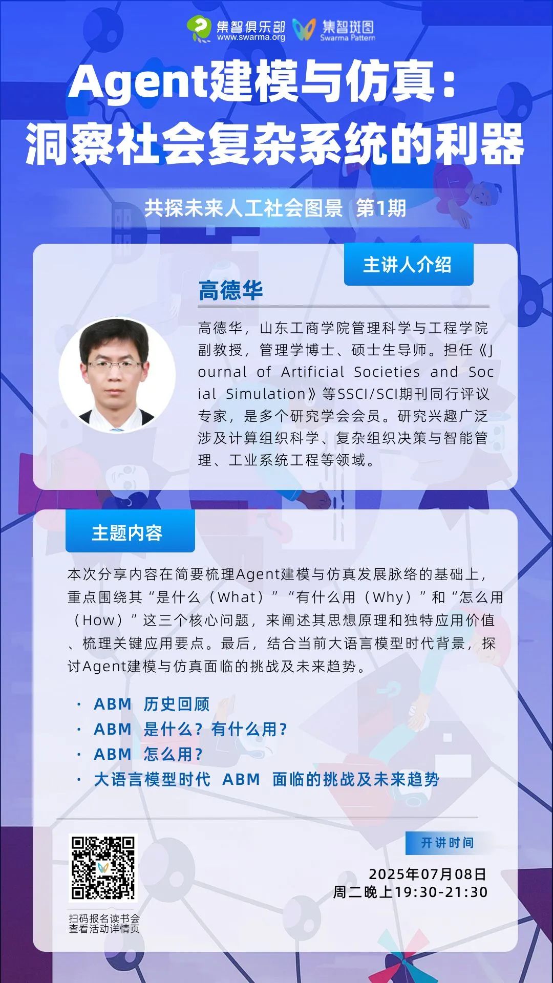 集智俱乐部联合山东工商学院副教授高德华、天津大学教授薛霄、北京师范大学教授张江、国防科技大学博士研究生曾利共同发起「大模型时代下的Agent建模与仿真」读书会。读书会自2025年7月8日开始,每周二晚上7:30-9:30进行,预计持续分享8周左右。扫码加入Agent建模与仿真的前沿探索之旅,一起共学、共创、共建、共享「大模型时代下的Agent建模与仿真」社区,共同畅想大模型时代人工社会的未来图景!