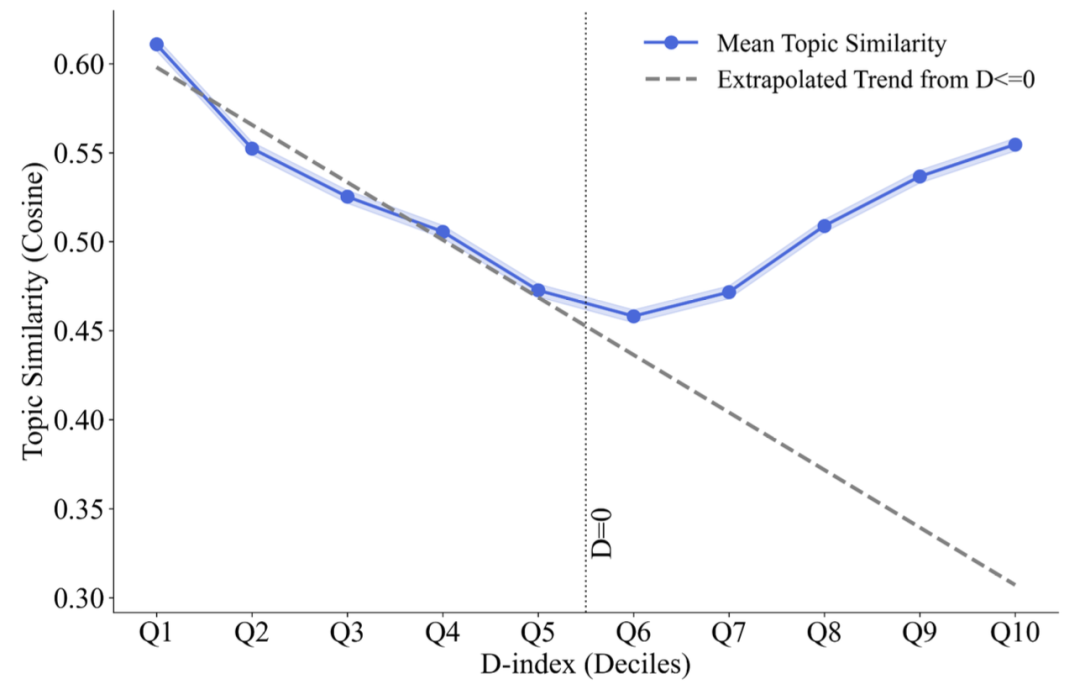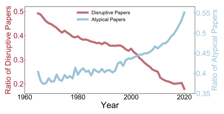 图 1.高度非典型引用论文的兴起和高度替代论文的衰落。