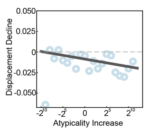 图 2. 论文的非典型性与颠覆性呈负相关。