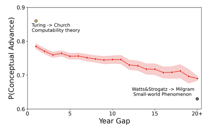 通过大语言模型对5万篇高D值论文分类,研究发现:理论替代平均比方法替代快3倍。例如,图灵机(1937)一年内替代丘奇的λ演算(1936),而瓦茨-斯托加茨的小世界网络模型(1998)耗时30年才替代米尔格拉姆的社会实验(1967)。这可能是因为新理论常以“逻辑优越性”快速胜出,而新方法需经历工具链完善和学界的适应。