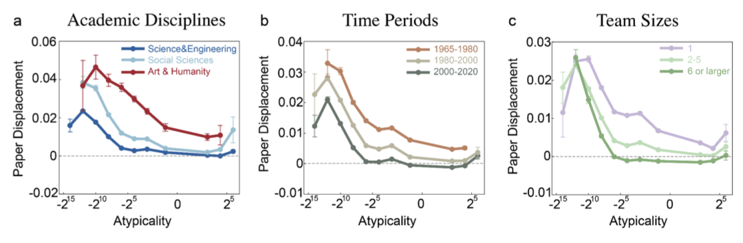 图 3. 增加论文的非典型性会减少其颠覆性。
