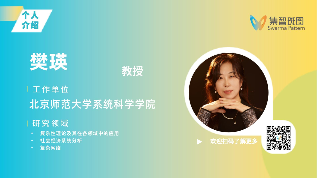 樊瑛,北京师范大学系统科学学院教授、博士生导师。现担任中国系统工程学会系统理论专委会主任、常务理事;中国环境科学学会生态环境复杂系统协同治理专业委员会副主任委员;中国工业与应用数学学会复杂网络与复杂系统专委会委员;中国人工智能学会社会计算与智能专委会委员等。研究方向为复杂系统理论及其在社会经济领域中的应用,特别是复杂网络研究,主持或参与多项国家自然科学基金项目,发表多篇有影响力论文。曾获得2009年度教育部新世纪人才。在中国大学慕课网开设《复杂网络分析》课程多轮次。