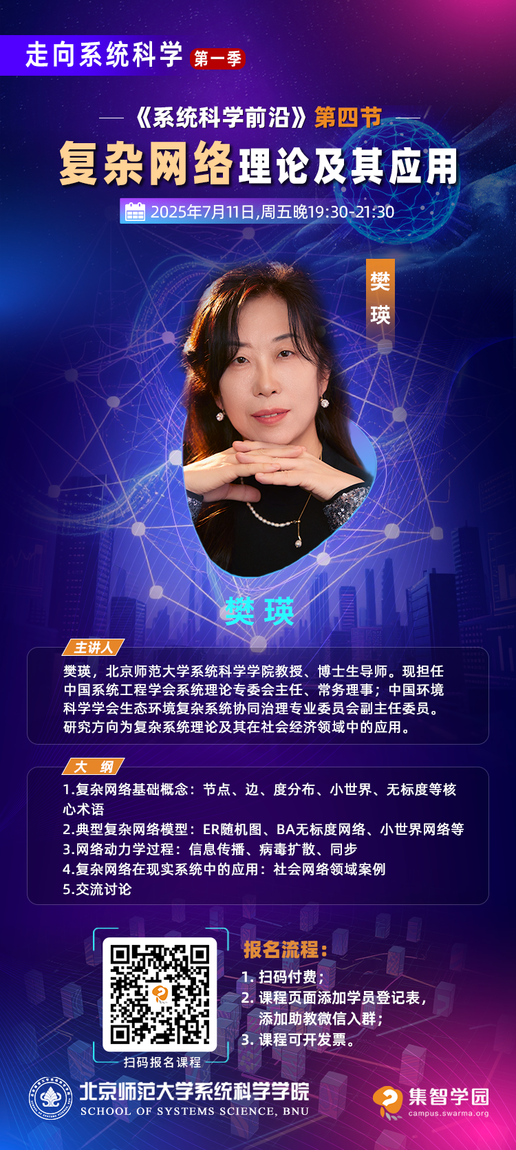 在本课程为系统科学核心课程,樊瑛教授将为大家讲解复杂网络的基本理论与典型模型,结合现实案例,探讨网络结构如何塑造传播、控制、协同与涌现行为,构建网络思维与分析能力。
